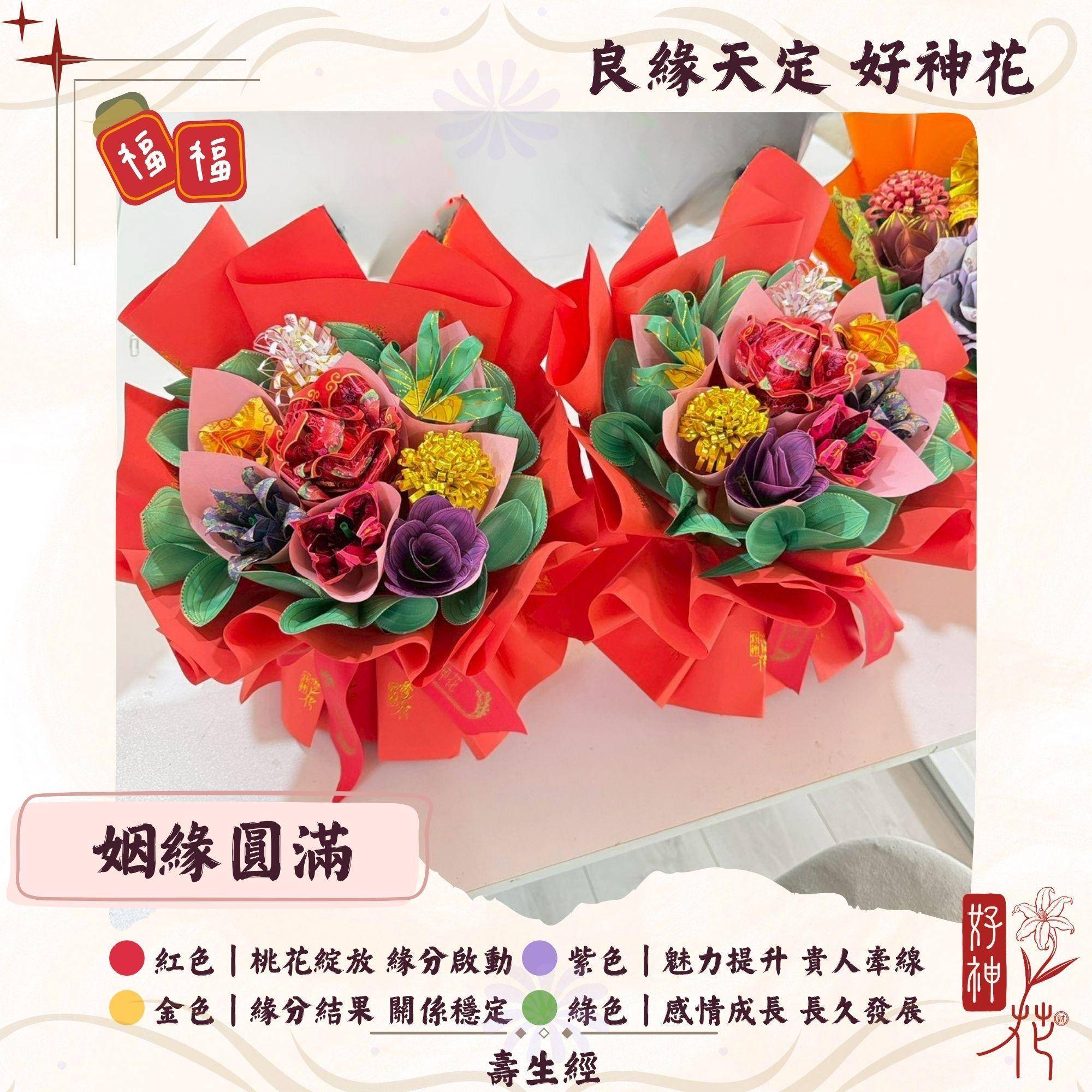 良緣天定 姻緣圓滿好神花(S鮮花款) 為三禾文創設計的姻緣祈福鮮花款式,結合紅、金、紫、綠四色能量, 象徵桃花綻放、緣分結果、魅力提升與感情成長。 適合月老祈福、姻緣加持、感情升溫與日常供奉, 透過誠心供奉祈願良緣天定、姻緣圓滿、感情穩定、幸福長久。